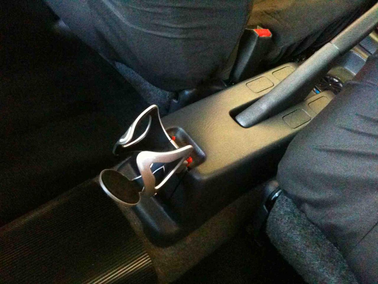 This is the finished product on the car. It is attached to the little rubbish flap behind the handbrake lever. The bottom bar that protracts from the bottom is actually what makes the whole thing really stable. The cupholder came attached to the middle air-con flaps when I bought the car (I'm pretty sure its the ones you can buy at K-Mart) and I removed it right away cause that didn't really seem like a very strong mounting point. I'd assume it would also cause a big mess if my drink were to fall from that height.