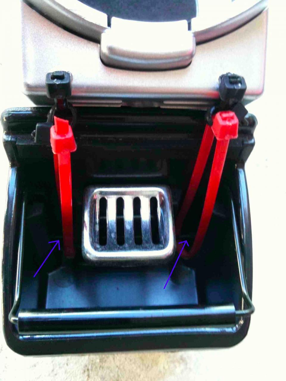 nice work. considered using black cable tires and maybe spray the cup hold to black for a OEM look?