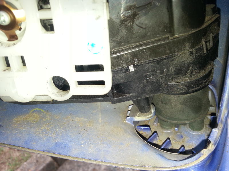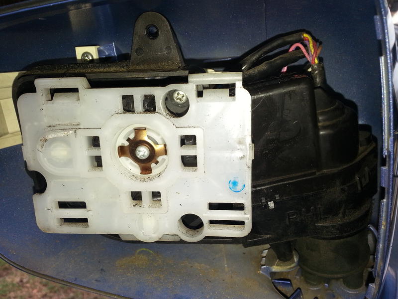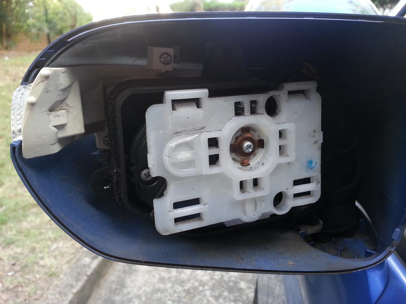 I opened the passenger mirror by pulling the mirror off from the bottom, unscrewed and removed the inner casing, and took some photos.