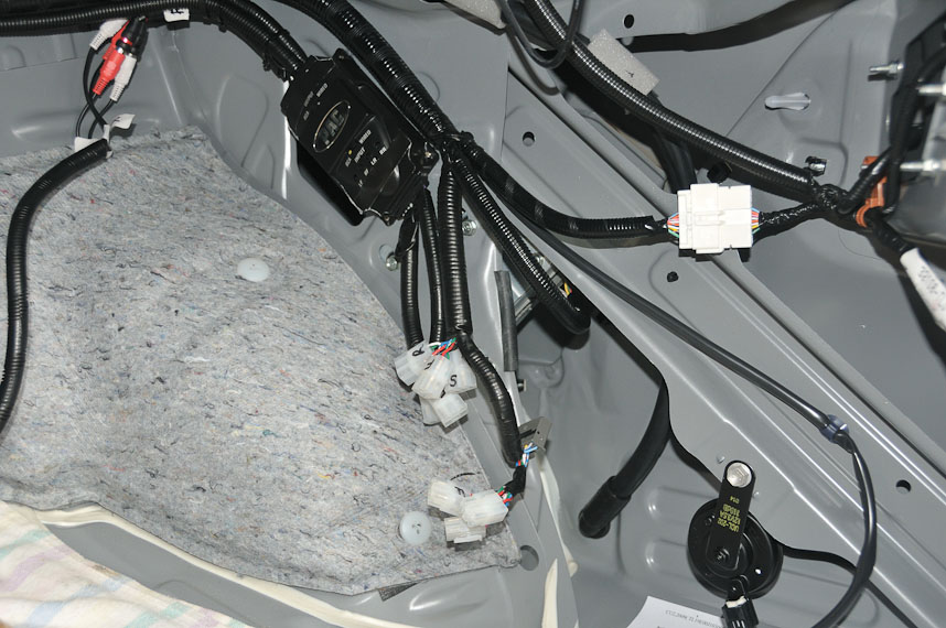 Splicing into the speaker output loom from the Panasonic amp. Speaker level inputs to the PAC SOEM-4 transformer based, DC coupled LOC and RCA outputs to the Focal amplifier.
