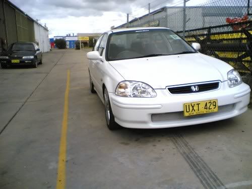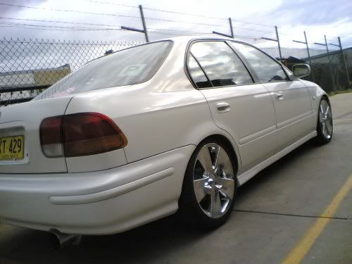 hey all, sorry to say but its far from stock, not 'just wheels and lower' i've spent alot of time and money on this car, i've done the exhaust, intake system, colour coding, clear side markers, custom mesh insert, adjustable suspention, full alpine stereo worth over $3000, i've got clear lights coming and full strut and sway bar set coming as well. so if you call that standard i think u have a prob. but anyway thanks heaps to all those who made good comments about makes it all worth it. yeah it was takin off a fone, so you don't need glasses hahaha.. and whats so bad about abouts chrome, i went for chrome because i wanted to stand out as i don't plan to get a big kit or anythin like that.. and i'm with chi, there are a great wheel apart from the fact that everyone has them. and that thigie on my fuel filler is a graphic of the honda symbol. here are a few more pics, takin off a better fone (some are a bit dodgy cause it still had the plastic cover over the lens). the colour codong cost me $500 but i got it bit cheaper. now thats not bad for a first year apprentice earnin f**k all and spendin most of it on grog and women...