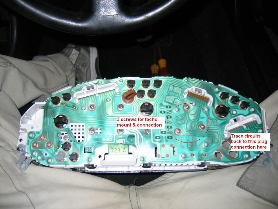 Looking at the back of the cluster,u will see 3 screws that hold the tacho in & also serve to make the necessary contacts with the circuit board.