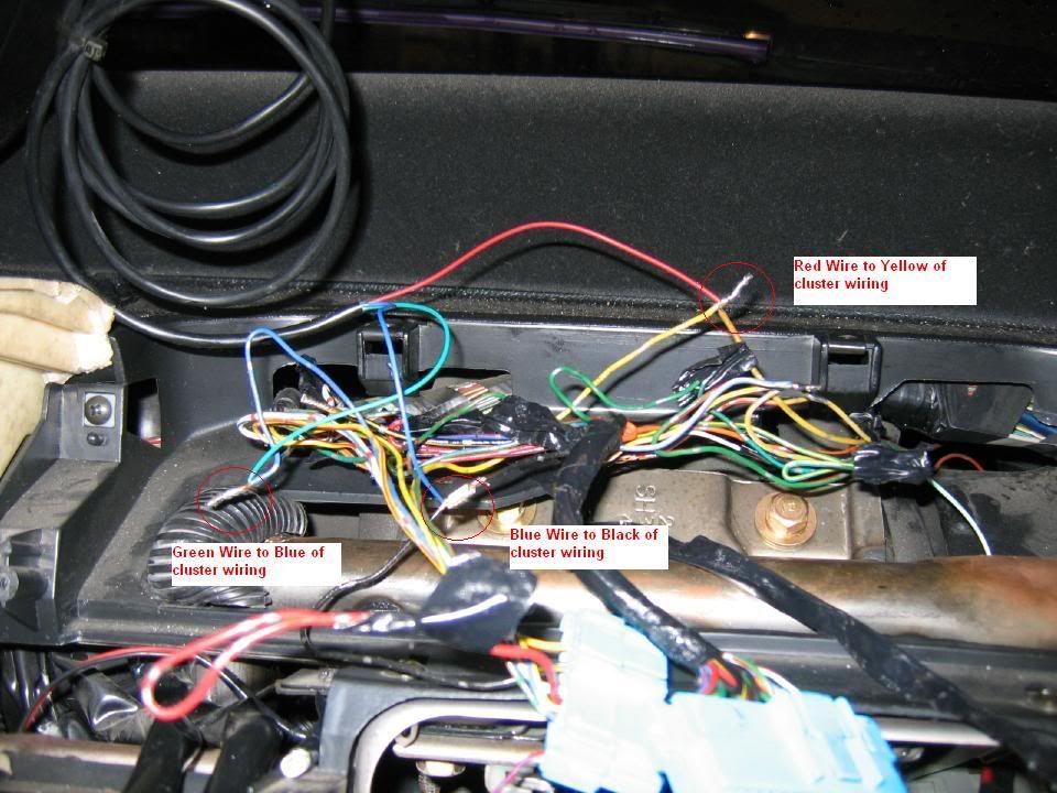 Now u will see where i have connected the red,blue & green wires from the gizzmo to the yellow,black & blue wires of the cluster wiring respectively.
