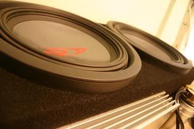 One sub box, made specifically for the subs. – correct volume, each sub has its own sealed cabnet, extremely compact, very stiff and strong, carpeted in black!