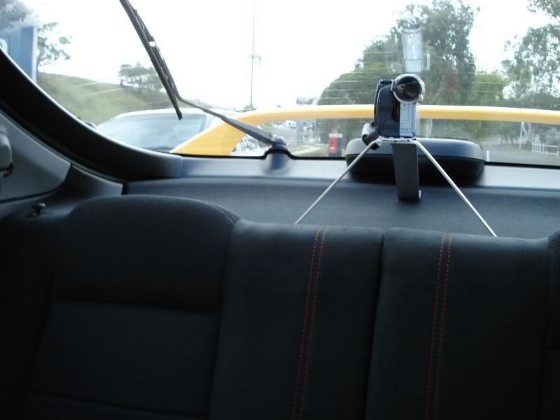 I usually keep my front seat in my car when I go to the track so I just made a mount that goes into the passanger seat head rest spot. Holds the camera fairly steady. I just use a normal digital camera that can record video. My dad uses his old DV camera with no problems.